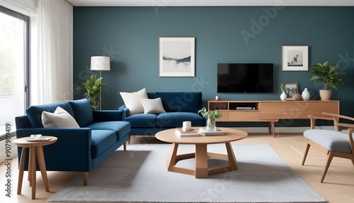 A modern indoor living room has a comfortable sofa