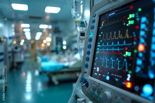 A modern intensive care unit (ICU) with advanced medical equipment and empty hospital beds, highlighting critical care and patient monitoring