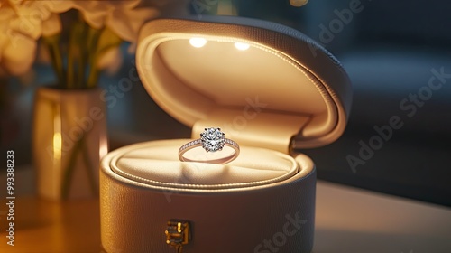 A modern jewelry box displaying a round-cut diamond ring, with soft lighting creating a romantic ambiance.