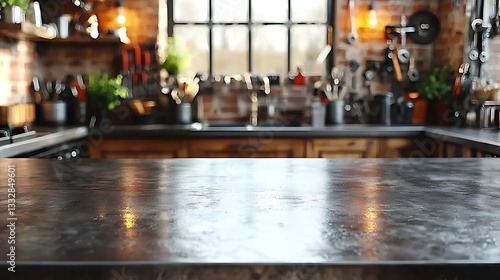 A modern kitchen with a foreground countertop and blurred background