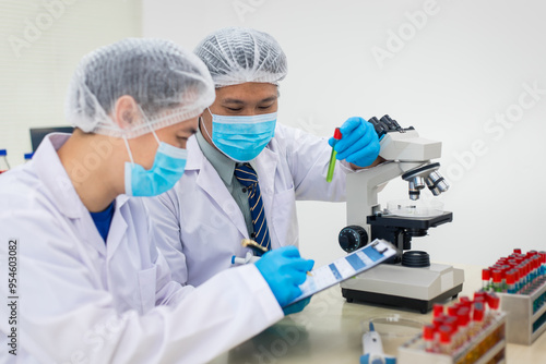 A modern laboratory scene showcasing scientists, both male , in lab coats, analyzing samples using microscopes and computers.