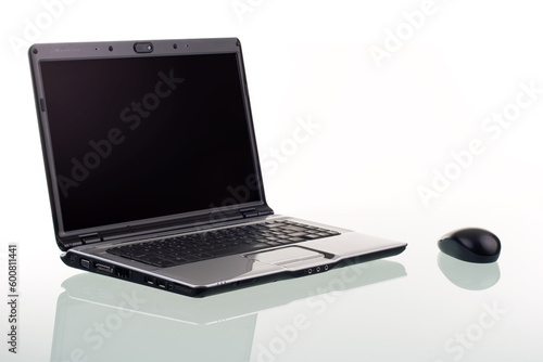 A modern laptop computer and wireless mouse with reflection on a glass surface.