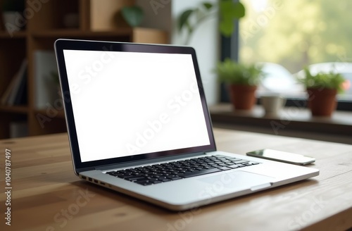 A modern laptop on a wooden table beside a smartphone with plants in the background during daytime