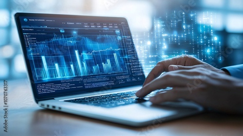 A modern laptop showcases digital business data analysis with graphs and charts. The professional setting highlights innovation and productivity in the workplace.