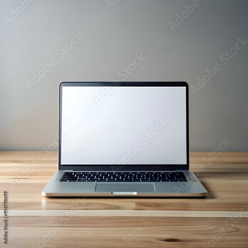 A modern laptop with a blank white screen sits on a wooden desk. ready for your text or graphics.