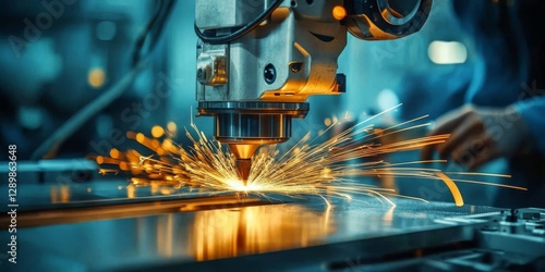 A modern laser cutter efficiently engages in precision engraving on metal, generating sparks as a factory worker meticulously oversees the innovative and advanced manufacturing process taking place