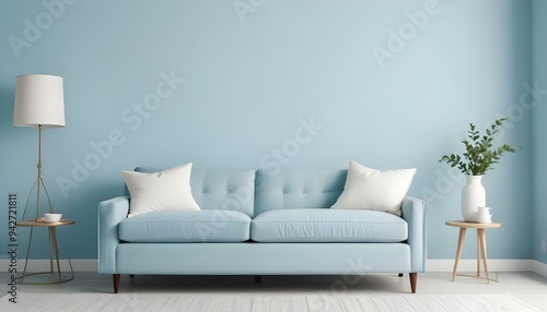 A modern light blue sofa with white throw pillows against a light blue wall.
