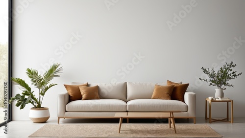 A modern living room features sleek wooden and black furniture, a television, minimalist decor, a potted plant, and a large window with ample natural light.