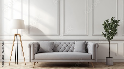 A modern living room featuring a gray sofa, floor lamp, and potted plant against a white wall.