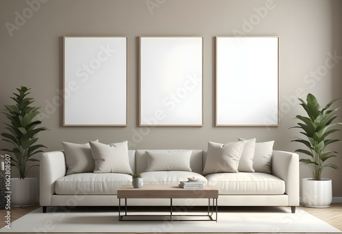 A modern living room with a beige sofa, beige throw pillows, and three empty white frames on the wall.