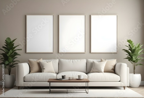 A modern living room with a beige sofa, beige throw pillows, and three empty white frames on the wall.