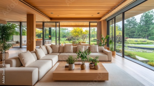 A modern living room with a soft beige sofa set and a natural wood coffee table