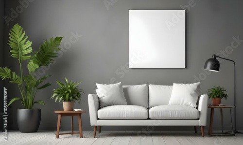 A modern living room with a white sofa, a potted plant, and a blank white canvas on the wall.