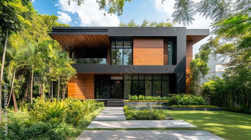 A modern luxury minimalist cubic villa with wooden cladding and black panel walls, surrounded by a landscaped front yard with sleek paths and lush greenery