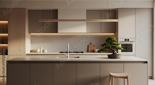 A modern minimalist kitchen with a large island, sleek cabinetry, and integrated appliances, illuminated by warm ambient lighting.