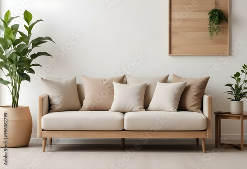 A modern, minimalist living room with a beige sofa, wooden frame, and decorative plants in the background.