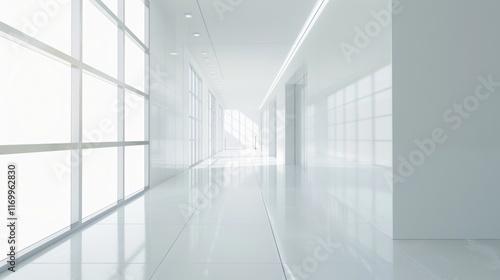A modern, minimalistic office interior with white walls and concrete flooring. The space is well-lit and features a futuristic design.
