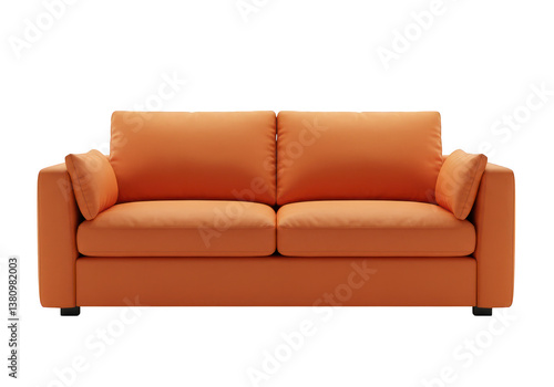 A modern orange upholstered two-seater sofa with matching cushions isolated on transparent background