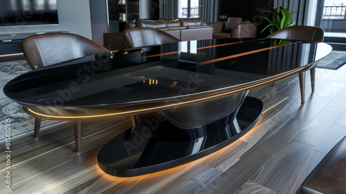 A modern oval dining table with a sleek black surface and hidden LED lighting, in a tech-themed dining room