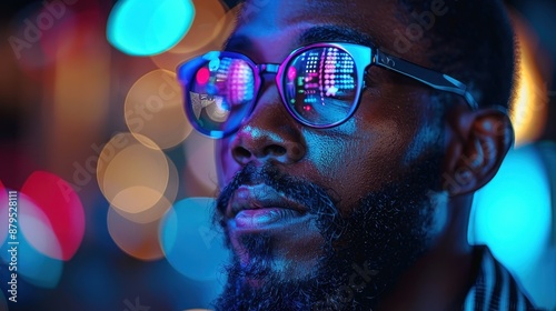 A modern pair of stylish glasses with dark frames set against a background of vibrant blue abstract bokeh lights, highlighting the sleek design and fashionable appeal of the eyewear.