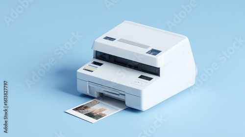 A modern photo printer on a light blue background, printing an image of a cityscape with vibrant colors