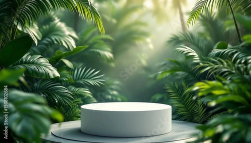 A modern podium for product design against the backdrop of a tropical forest