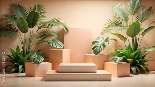A modern podium surrounded by tropical plants provides an elegant stage for product display and presentation