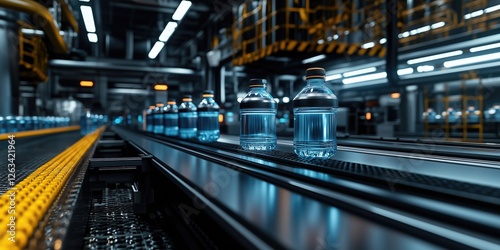 A modern production line showcasing clear water bottles moving along a conveyor belt in a high-tech facility, symbolizing efficiency and quality.
