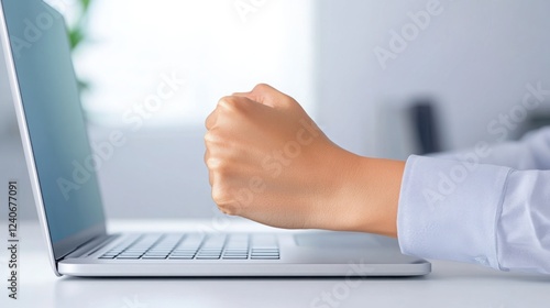 A modern professional seated at a white office desk, stretching their wrists by rotating them gently