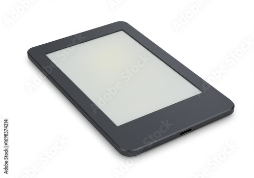 A modern, rectangular e-reader displays a blank, light-gray screen against a dark gray casing.