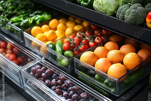A modern refrigerator stocked with fresh fruits and vegetables in clear drawers