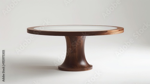 A modern round table with a wooden base and a smooth surface, ideal for dining or meetings.