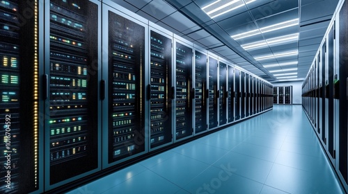 A modern server room with rows of servers in racks, glowing indicator lights, and a clean, well-lit environment with tiled flooring and ceiling lights.