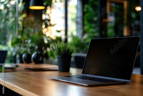 A modern setup with multiple colleagues on a video conference, showing a professional digital meeting space with laptops, headsets, and a clean office backdrop