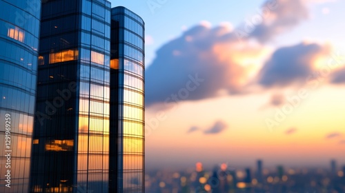 A modern skyscraper reflecting the evening sky with vibrant colors, Ideal for use in urban planning, architecture, real estate marketing, or business presentations showcasing contemporary design,