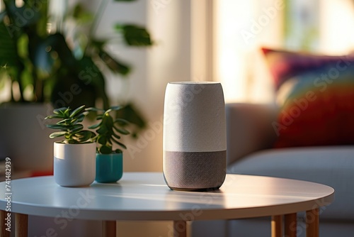 A modern smart speaker on a table next to a potted plant. Suitable for technology and home decor concepts
