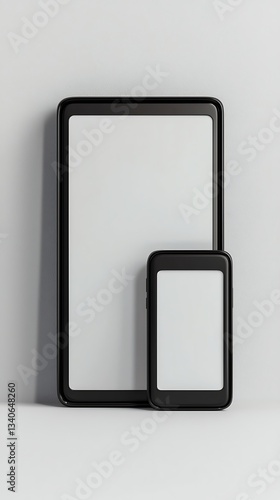 A modern smartphone and tablet are displayed against a minimalist background, showcasing sleek designs and empty screens.