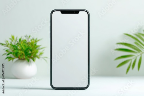 A modern smartphone with a blank screen stands upright on a white surface, flanked by green potted plants in a minimalistic setting.