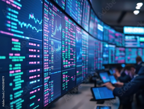 A modern stock exchange display showcasing financial data, graphs, and trading information on digital screens.