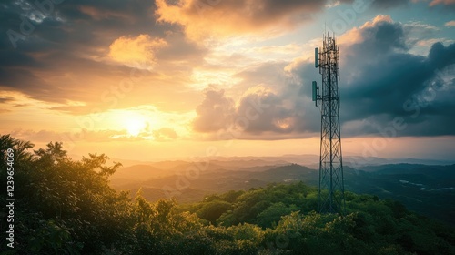 A modern telecom tower rises amidst lush greenery and a dramatic sky, representing the harmony of advanced technology with the natural world.