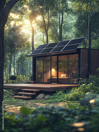 A modern tiny house in the middle of a lush green forest