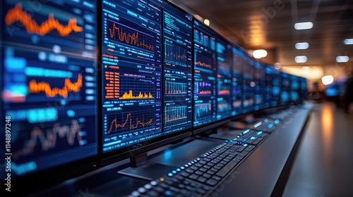 A modern trading room filled with multiple computer screens displaying dynamic financial data and stock market trends