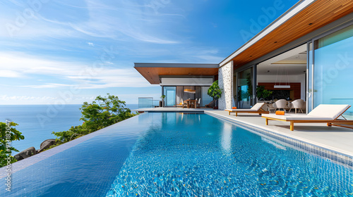 A modern tropical villa with a spacious infinity pool and ocean view.