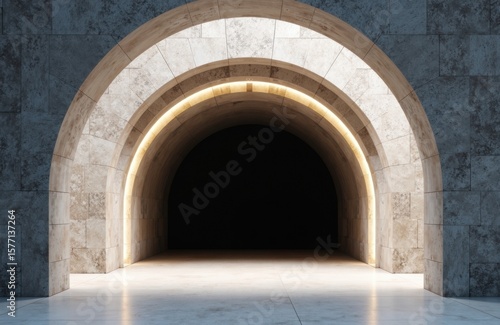 A modern tunnel with illuminated archway leading into darkness