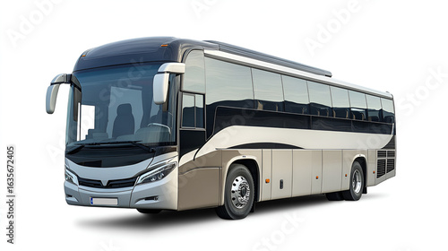 A modern two-tone silver and black coach bus for passenger transport, isolated on a white background.