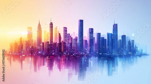 A modern vector cityscape with sleek skyscrapers and clean lines, vibrant gradient tones of blue and purple, minimalistic and futuristic style on a white background