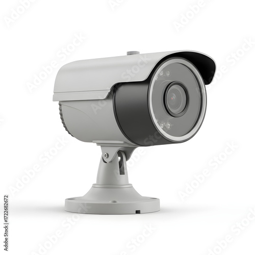 A modern, white, outdoor security camera with a dark gray accent and a visible lens, mounted on an adjustable bracket against a white background.