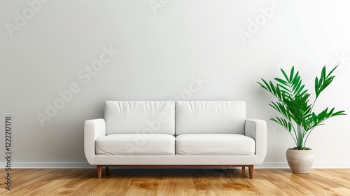 A modern white sofa with wooden legs sits against a blank wall, accompanied by a lush green plant in a ceramic pot, creating a serene living space.