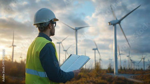 a Modern Windmill Power Station with Engineers in the Blurred Background. Emphasizes Renewable Energy, Innovation, and the Integration of Technology in Sustainable Power Generation.