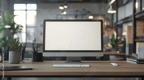 A modern workspace featuring a blank computer screen on a wooden desk.